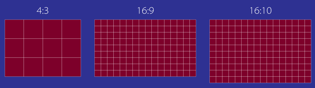 Remember playing with Legos as a kid? Imagine the Legos spread out on the table in front of you. Grab some bricks and lay them out with 4 dots across and 3 dots down. That’s a 4:3 aspect ratio. 16 dots across and 9 down? You’ve now got 16:9. Add one more row across the bottom: 16 across and 10 down is 16:10.