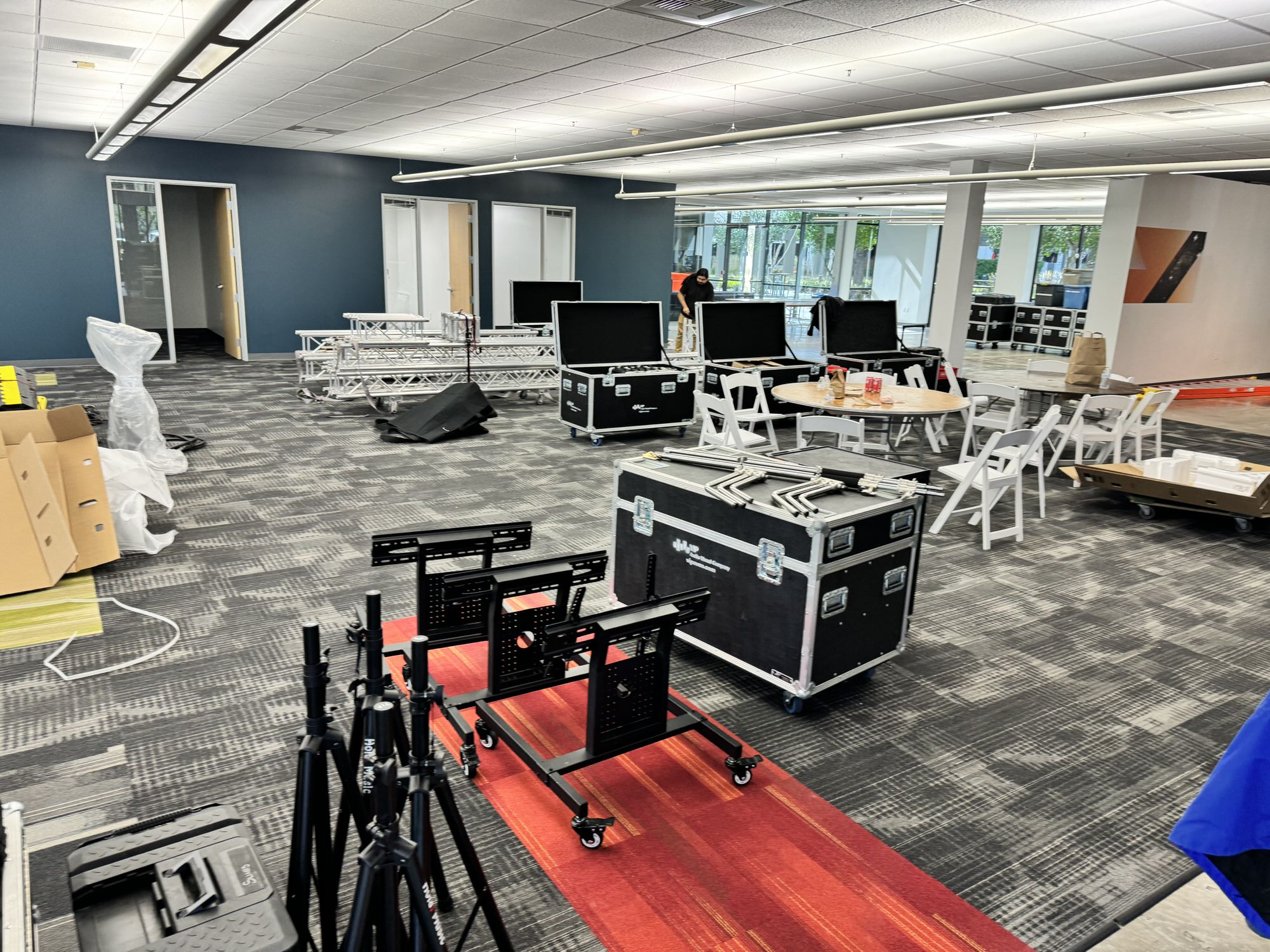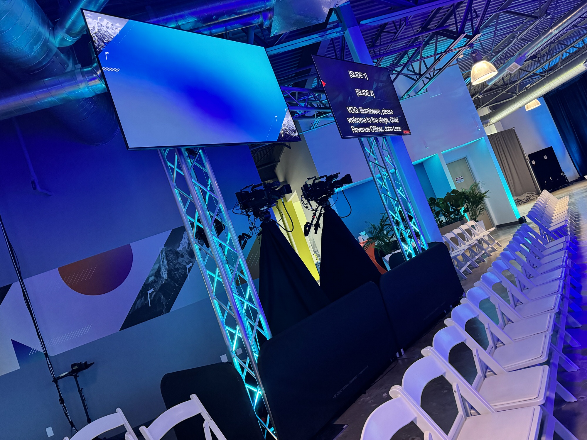 How do you transform an empty office space into a high-end event venue? Our client pulled out all of the stops for this event, creating a high-impact all-hands meeting for their team. VIP Audio Visual was instrumental in this transformation, providing all of the technical and staging pieces for the event. Our team devoted three days to our setup process at the client's Sunnyvale office prior to their three-day event, which featured five breakout rooms in addition to the large general session.