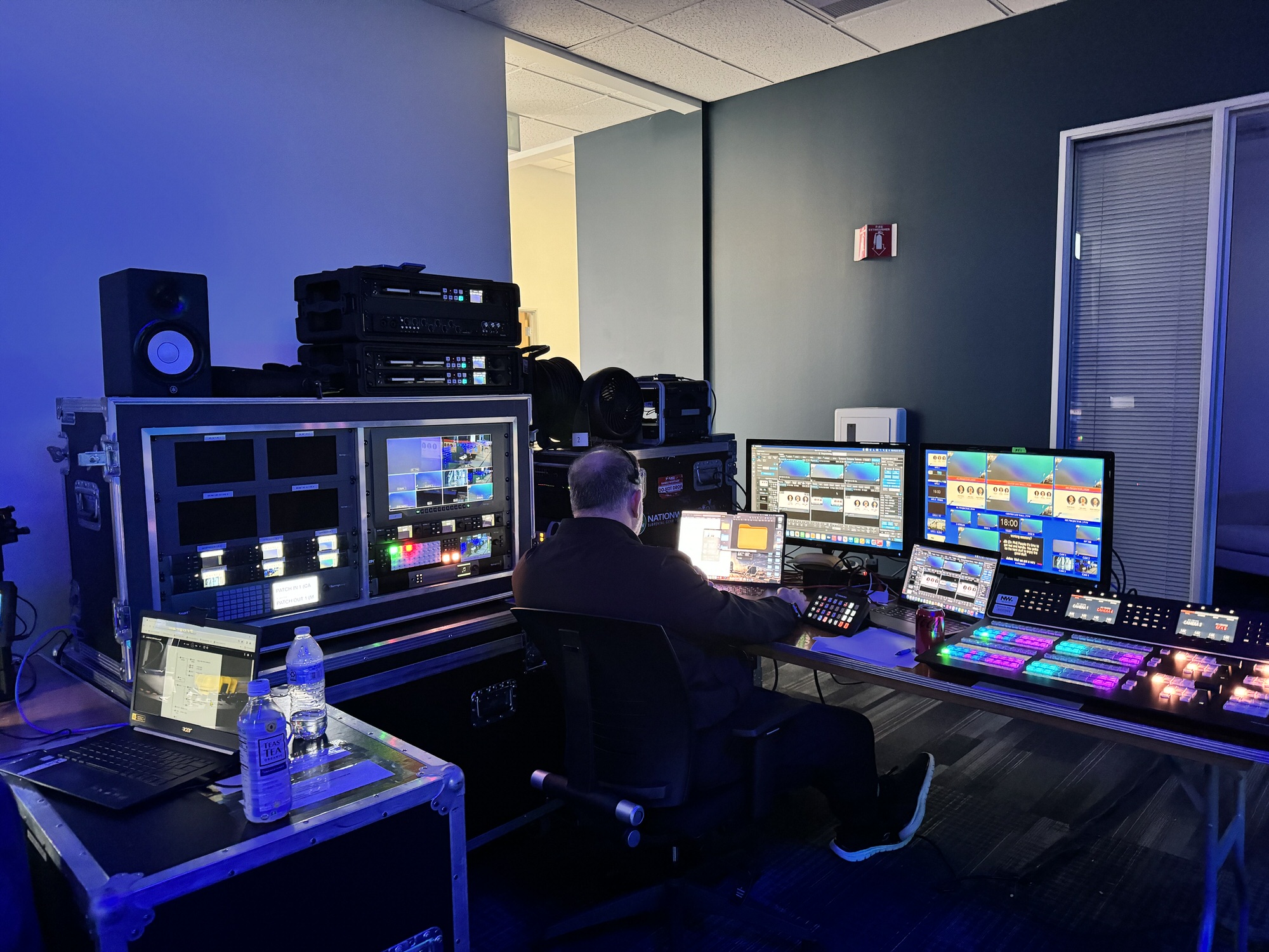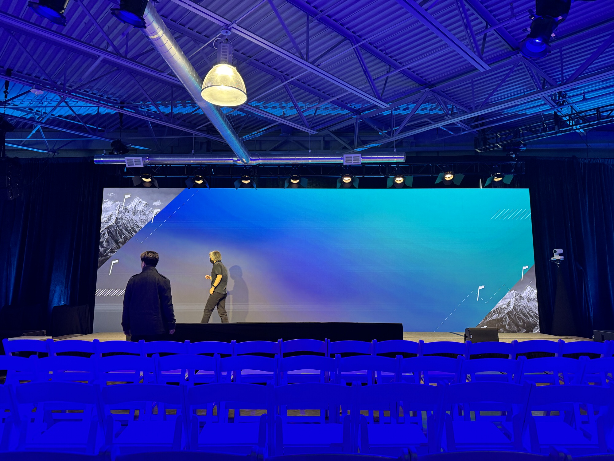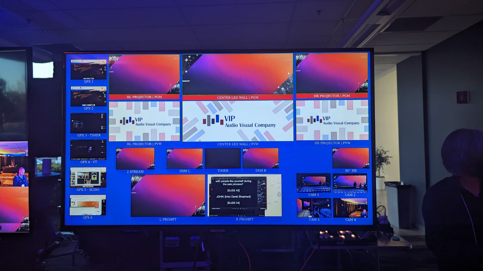 Behind the scenes, our video team managed the system with a combination of video processing tools. Primary switching of content sources and cameras was handled by our technical director on a 2-layer switching console, which created independent streams for the in-house screens and an online audience. At the same time, a secondary system provided scaling and routing to the LED wall, presentation screens, downstage monitors, and prompters.