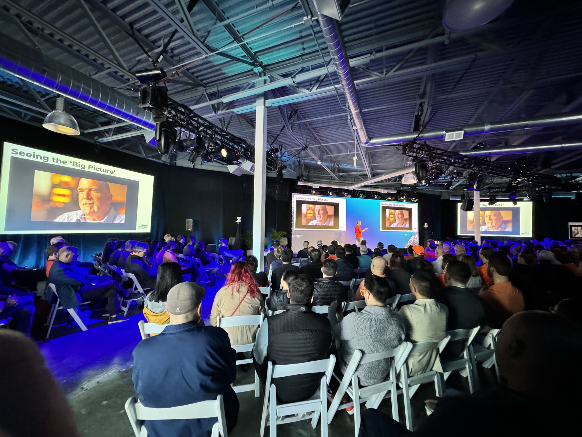 In the general session, we built a large LED wall behind the stage as the focal point of the set, complemented by two projection screens on either side of the stage for primary presentation content. The widescreen LED was 24'x12', using some of the highest resolution LED panels available on the market today. The high-resolution wall looked great on camera, completely eliminating the moiré effect so common with lower resolution screens.